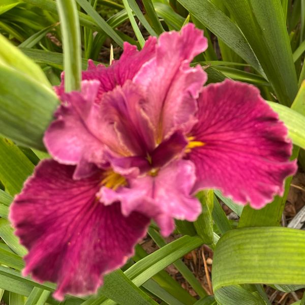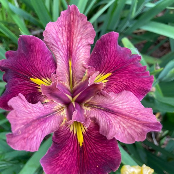 Sdlg. ADG 18-LA-02-02, LA, 40" (101.5 cm), E L. S. light violet, ruby red outer centerline, yellow line signal; style arms mulberry; F. red violet, yellow thumbprint signal; beardless. Eyes Wide Open X Seminole Sunrise.